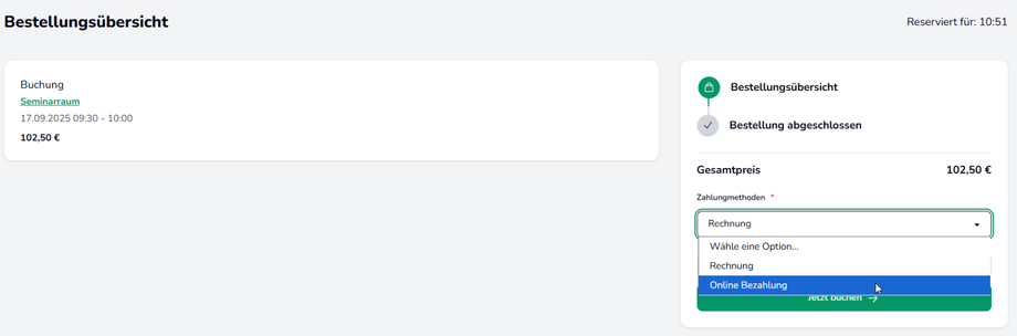 Danach können Sie noch die gewünschte Zahlungsmethode auswählen. Bei Anbietern mit Direktbuchung kann, wenn es eingerichtet ist, direkt Online bezahlen.