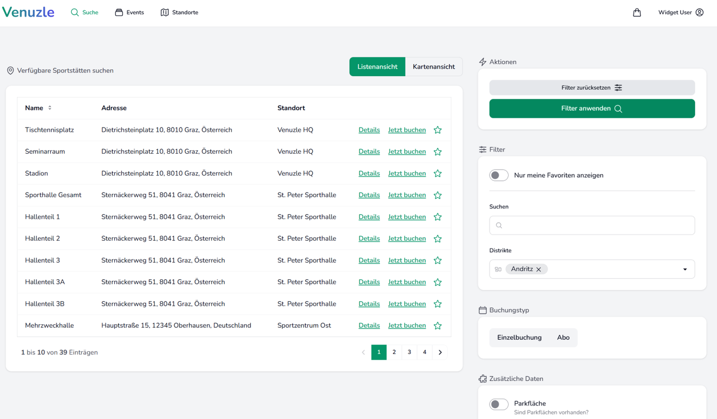 Hier können Sie Ihre Favoriten markieren, nach Namen der Sportstätten und Hallen, den Bezirken oder nach Verfügbarkeiten suchen.