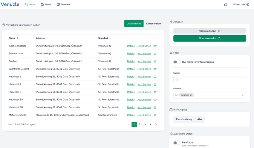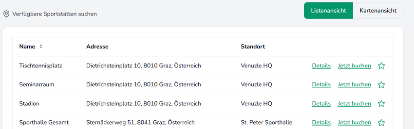 Über die Listenform gibt es ebenfalls die Möglichkeit die Sportstätte aufzurufen. Dafür klicken Sie auf "Details" Mit einem Klick auf "Jetzt buchen" können Sie auch direkt eine Buchung starten.