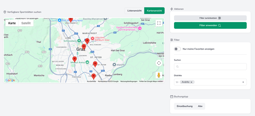 Sie können sich die Sportstätten in einer Kartenansicht anzeigen lassen. Klicken Sie dafür einfach auf Kartenansicht (nicht bei allen Anbietern erhältlich).