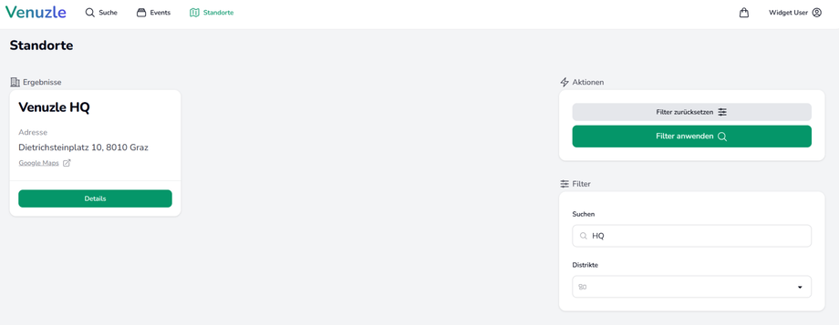 Hier können Sie nach den Standorten suchen oder nach Bezirken filtern. Sie bestätigen die Suche mit einem Klick auf "Filter anwenden". Sie können Standorte direkt über Details öffnen.